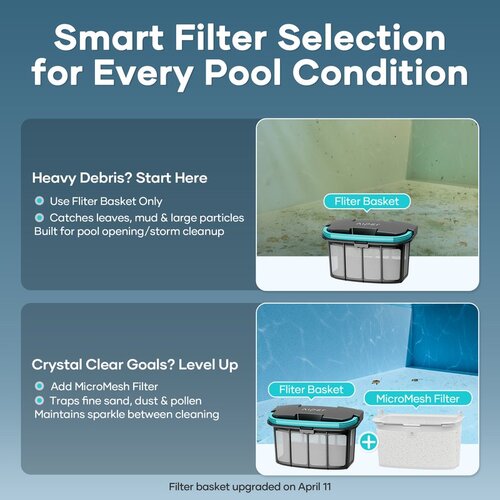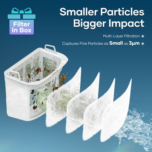 Den rummelige 5-liters filterboks opsamler store mængder snavs, så du skal tømme sjældnere. Medfølgende MicroMesh™-filter fanger de allermindste partikler ned til 3 mikrometer og giver ekstra klarhed i vandet – perfekt ved pollen, fint støv eller alger.