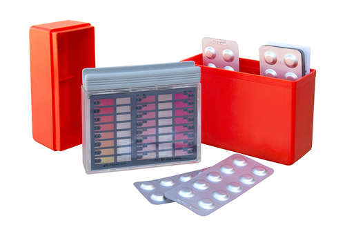 Settet inneholder 20 pH-testtabletter Phenol Red samt 20 DPD1-testtabletter for måling av fritt klor eller bromin. Ekstra testtabletter kan kjøpes når som helst for å sikre regelmessig kontroll av vannkvaliteten. Tablettene til dette testsettet har grønn skrift på baksiden av folien.