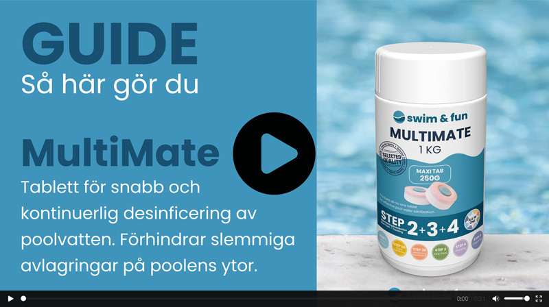 Dosering: MultiMate placeras direkt i skimmern och doseras med 1 tablett per 20 000 m3 poolvatten. En ny tablett tillsätts när det är ca 10 % kvar — vanligtvis efter cirka 7 dagar. Placera alltid tabletterna i en flytande klordispenser eller i poolens skimmer. Det rekommenderas att man testar klorhalten och pH-balansen regelbundet och håller innehållet av fritt klor mellan 0,5 och 1,0 mg/l. Friskt poolvatten har ett pH-värde mellan 7,0 och 7,4. Med en hälsosam vattenbalans får du den bästa nyttan med vattenvårdsprodukter. Tabletten kan inte användas tillsammans med inline klorinatorer. Klor och pH-värde mäts enkelt med Swim & Funs testremsor.