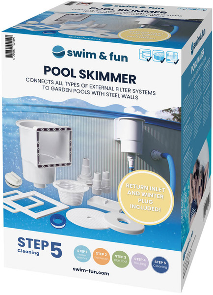 The skimmer can be adapted to the varying water levels. The set includes skimmer basket to collect larger particles, and suction plate for connecting the suction hose to the filter system through the skimmer when the pool bottom must be vacuumed.