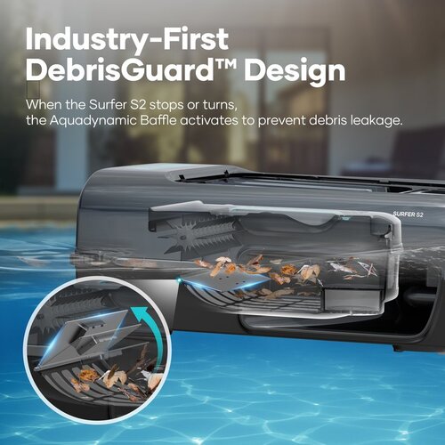 Thanks to its advanced Smart Navigation and dual sensors, the Surfer S2 moves intelligently across the water, avoiding obstacles like ladders and skimmer areas. The unique DebrisGuard™ technology prevents collected debris from escaping when the robot changes direction or stops – keeping your pool crystal clear.