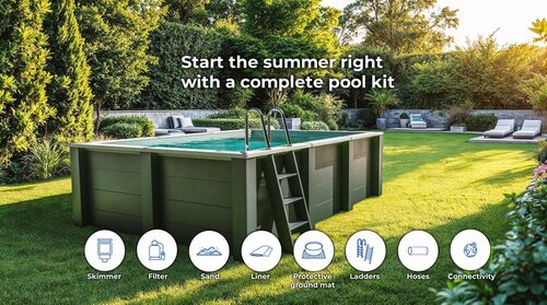 The pool package includes everything you need: filtration system with pump, liner (the inner pool membrane), ground cover, skimmer, steps, and ladder. Filter sand is included, so you can start using the pool right away.