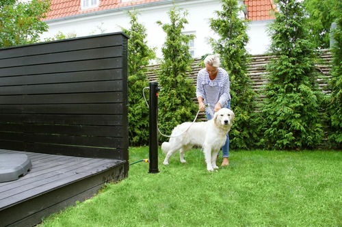 Would it not be ideal to be able to rinse yourself, the children or the dog off with nice solar-heated water, after a run in the wet and muddy forest, or a trip to the beach. The practical Cannes solar shower is a handheld model with a large 9 litre hot water tank, which makes rinsing off pleasant, easy and accessible.