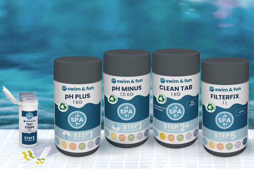 The set contains CleanTab for disinfecting the water and strips for easy testing of the pH and chlorine level. Use pH-Plus and pH-Minus to adjust the pH level. Filterfix for efficient cleaning of the hot tub’s filter.